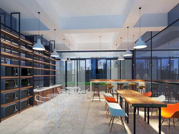 辦公室茶水間設(shè)計:員工在這里休息、娛樂,這里采用的是工業(yè)風的設(shè)計,目的就是希望員工在這里沒有任何壓力,讓員工在這里得到暫時的安寧。