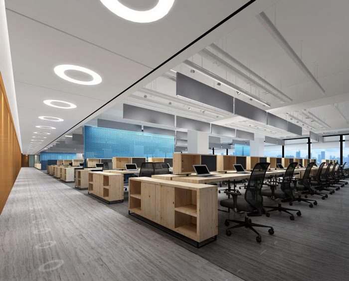 辦公室辦公區(qū)域設(shè)計:開放式的辦公區(qū)域,設(shè)計師采用加長版的辦公桌,在滿足辦公需求的同時,為企業(yè)打造人性化的辦公空間。