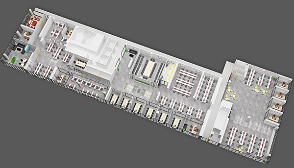 設計師從建筑空間形態(tài)出發(fā),充分挖掘和提升其價值,著重分析各個空間的體塊關系,通過大面切割的收發(fā)突破整齊劃一的空間規(guī)律,使之隔而不斷,產(chǎn)生獨特的節(jié)奏和韻律,從而打造了一個兼具科技感與時尚感的辦公空間。