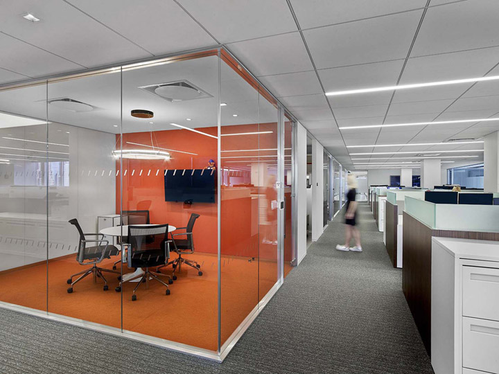 兩個樓層沿周邊設計的辦公室均采用通透的玻璃隔墻,即帶來充足的室內(nèi)采光,也彰顯了公司所倡導的透明與連接的文化。