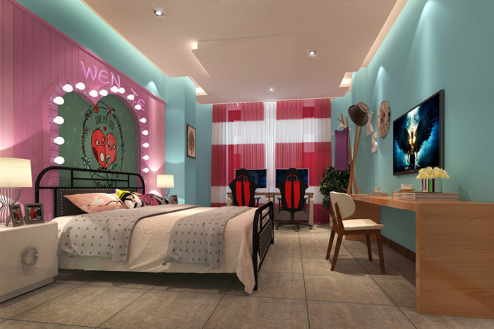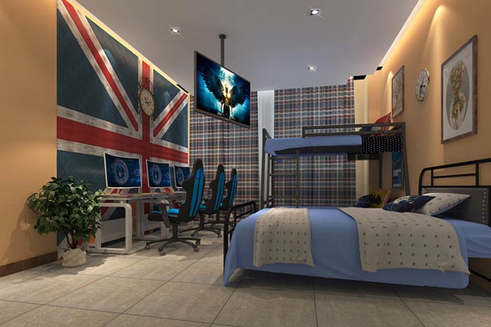 電競(jìng)酒店客房設(shè)計(jì):客房的設(shè)計(jì)不是千篇一律,而是各有特色,這樣的目的就是為了更大范圍的貼合客戶的需求,娛樂、舒適與一體,是設(shè)計(jì)師設(shè)計(jì)的重點(diǎn)。
